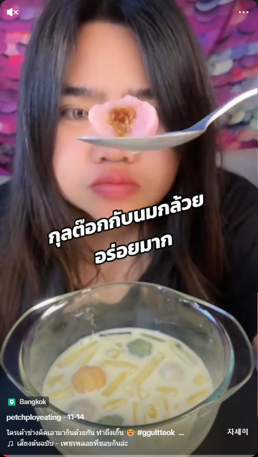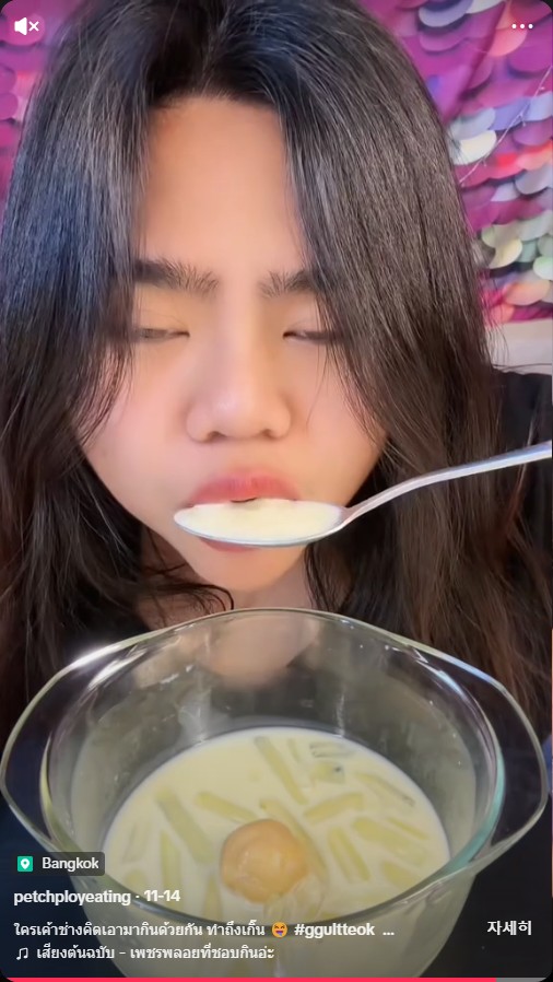 Nisarputrii와 다르게 Petchployeating에 대해서는 자세한 정보가 없습니다. 틱톡에서 활동하는 먹방러라는 것 외에느 별 다른 정보가 없네요. 꿀떡 영상을 보려면 위 틱톡 링크로 들어가시면 됩니다. 컴퓨터로도 볼 수 있습니다. 그런데 저는 의문인 것이, 외국에서 엄청 유명한 인플루언서들도 아닌데 왜 꿀떡 시리얼이 엄청나게 인기인 것처럼 뉴스에서 말한걸까요? 참 신기하네요.