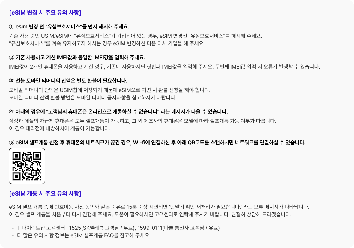 - ESIM은 한 기기에만 설치 가능하고, QR코드는 한 번만 사용 가능