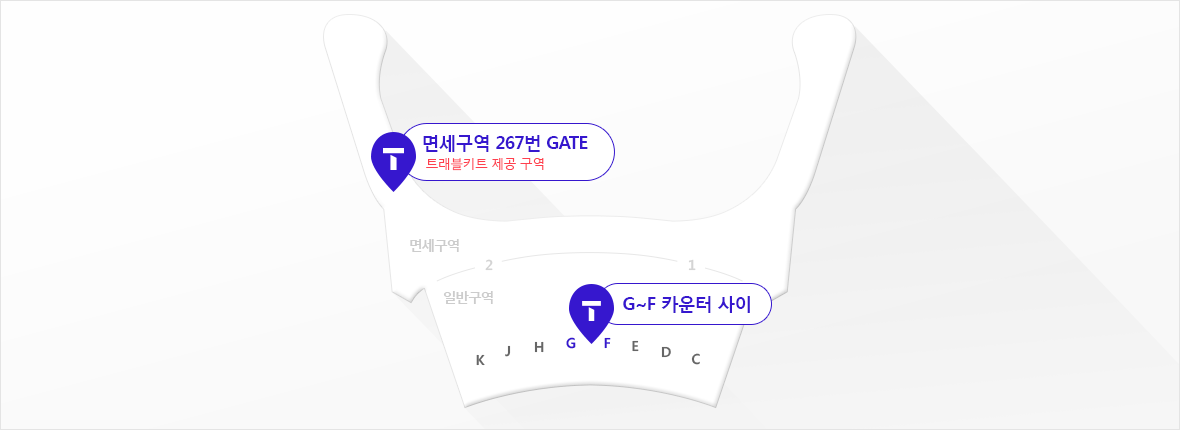 • 제2터미널 3층 출국장 면세구역 267번 GATE, G~F카운터 사이