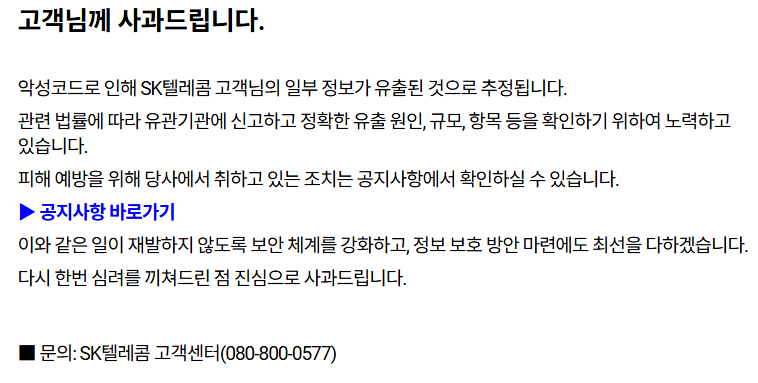 저는 SKT를 쓰지 않지만 저희 부모님이 쓰고 계셔서 걱정이에요. 내 유심칩이 해킹당했는지 안 당했는지 확인하려면 080-800-0577로 전화해서 확인하시면 됩니다. 아마 저기서도 유심보호서비스에 가입할 수 있을거에요. 지금 뉴스에도 잘 안 나오고 SKT놈들 조용히 넘어가려는 거 같은데 꼭 문의하세요.