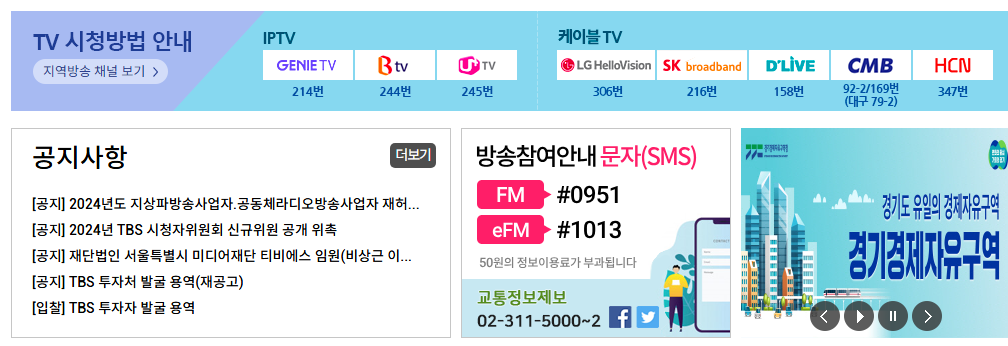 위 버튼을 누르면 TBS 홈페이지에 바로 연결됩니다. 검색에도 잘 나오지 않는 홈페이지를 소개하고자 이 글을 쓰는데요, 허위 사실을 적는 사람들이 많기 때문에 이 블로그를 통해서 접속하시는게 안전할거에요. TBS는 서울시가 운영하는 공영방송으로, 교통, 시사, 문화 관련 정보를 심도 있게 전달하는 방송국입니다.